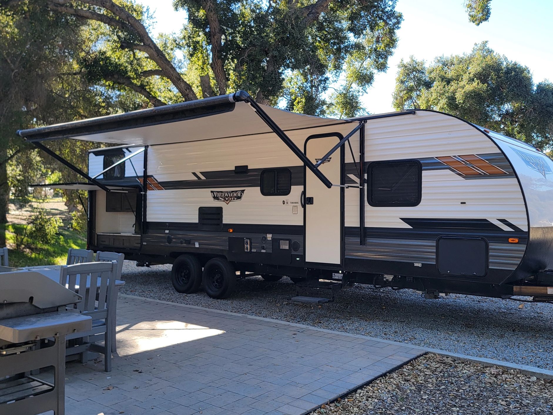 The 28' Wildwood travel trailer, rv rental Temecula, features a single slide. As you enter this rv rental, the private bedroom is to your right. In the bedroom you will find a comfortable walk around queen bed. The living and kitchen areas offer a sofa, dinette slide, entertainment center, double kitchen sink, three burner range with oven, microwave, and refrigerator. In the rear you will find the bathroom and second bedroom with 3 twin-size bunks. The bathroom offers a toilet, cabinet and large shower. The best rv rental Temecula.