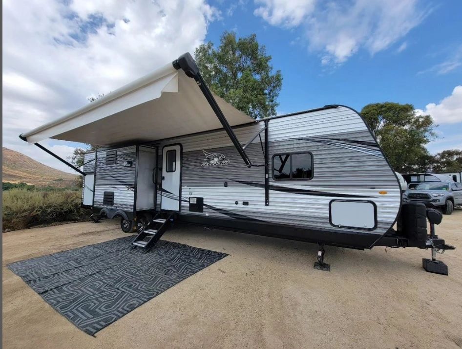 2021 Jayco Jay Flight 33’ travel trailer rental sleeps 10 and gives you the comfort to camp in style. This rv rental has a private bedroom with a queen bed, a bunk room with two sets of bunk beds, and three slide outs which makes it extremely spacious. The kitchen has plenty of storage and an island for extra counter space. On the outside it comes equipped with an outdoor kitchen with small refrigerator and 2 burner stove top. We do deliver for a fee, which allows you to arrive to your destination and relax. The best rv rental Temecula.